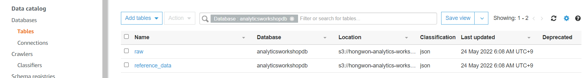 우측 tables added 열에 2 라고 되어있는데 이는 s3의 data 폴더 중 raw 폴더 와 reference_data 폴더를 테이블로 만들었다는 것을 뜻함