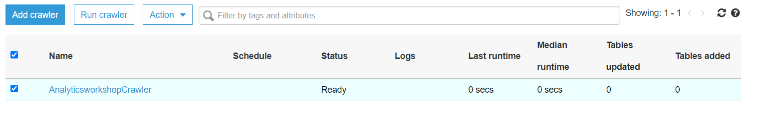 analyticsworkshopcrawler 체크 후 Run crawler 버튼 선택