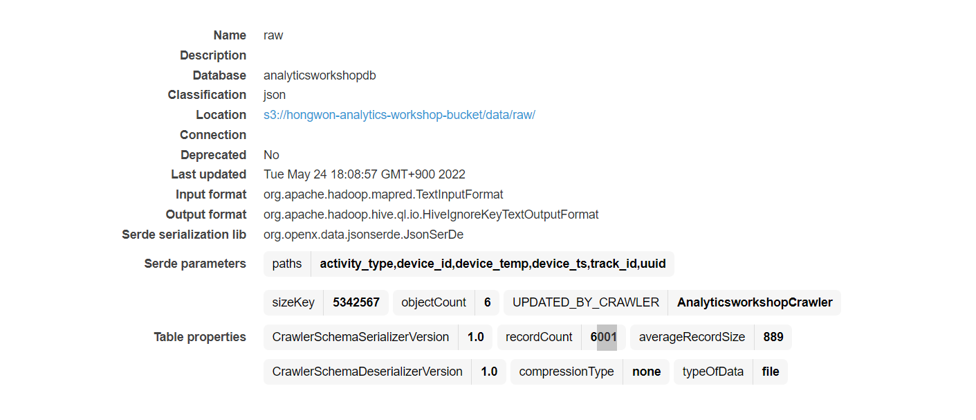 다음은 raw 테이블 클릭시 볼수있는 raw 테이블의 세부 사항