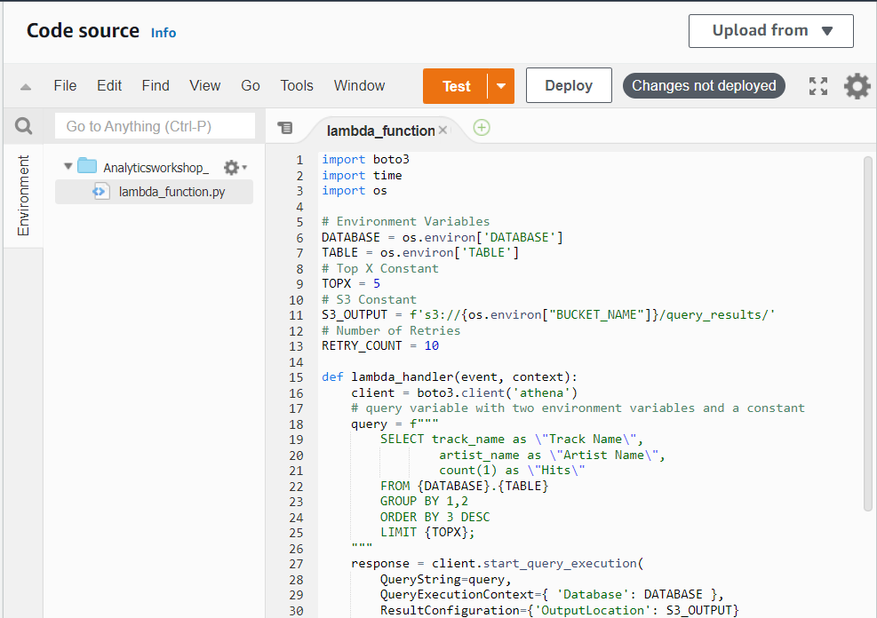 람다 함수를 작성하여 Athena가 S3의 processsed data에서 Hits 별 Top 5 Popular Songs를 쿼리하고 가져 오는 코드를 호스팅