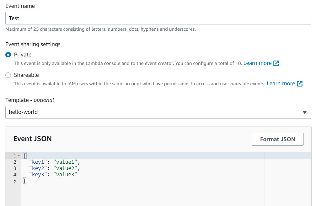 - Create new test event 가 기본적으로 선택되어 있습니다.