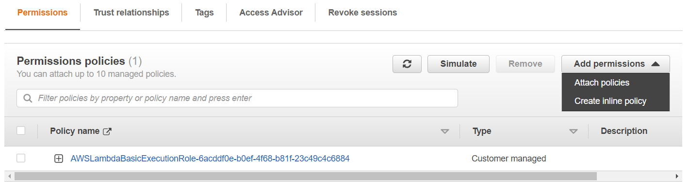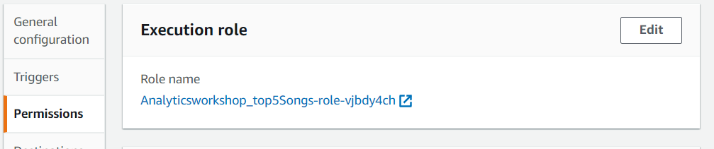 - Execution Role 아래의 Role 을 클릭하여 새로운 IAM 콘솔탭을 엽니다.