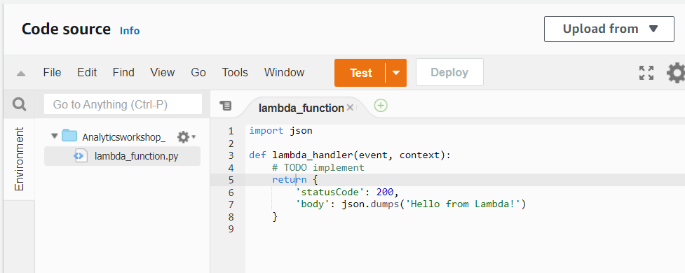 이제 함수를 테스트 할 준비가 되었습니다. 함수 Code 섹션에서 Deploy를 클릭하여 먼저 함수를 배포합니다.