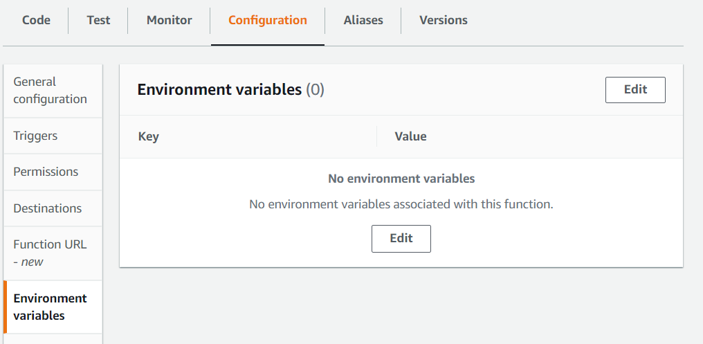 Configuration 탭을 클릭하고 좌측의 Environment variables 선택