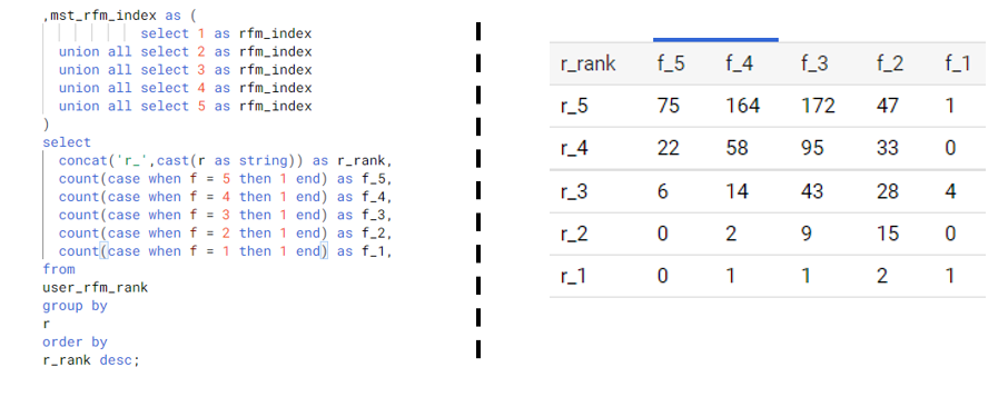 - rfm_flag 임시 테이블의 case 문에서 rfm_index와 r 이 같을 경우 1, 아닐 경우 0을 도출.