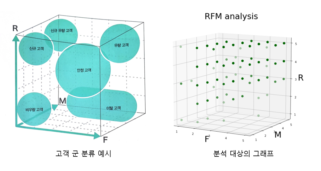 - user_rfm_rank 테이블의 'r', 'f', 'm' 열과 3차원 그래프를 비교하여 고객군 분류 예시와 같이 속성별로 고객군을 분류할 수 있음