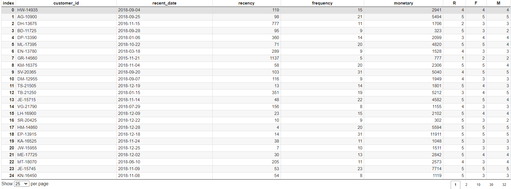 -> 단, 이 집계는 R, F, M을 따로 보기 때문에, 이것 만으로는 '신규 고객', '우량 고객', '이탈 고객' 등 고객군을 분류할 수 없음.