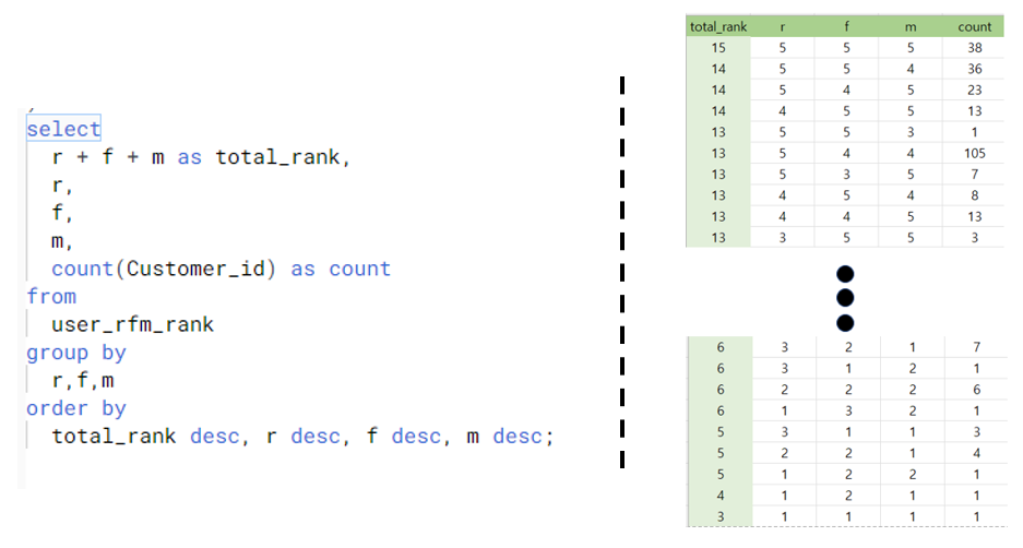 - purchase_log, user_rfm, user_rfm_rank 임시 테이블이 생략된 캡처 화면임.