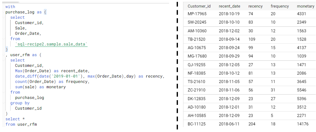 - Date_diff(date('2019-01-01')), max(Order_Date), day)로 2019-01-01과 최근 구매일의 차를 구함 (작을수록 최근)