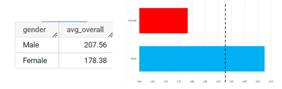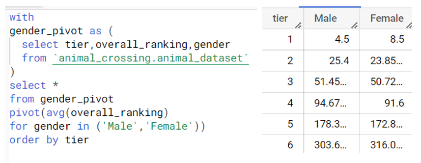 - 빅쿼리의 pivot 기능을 사용하여 티어별 성별 인기 순위를 구현하였습니다.