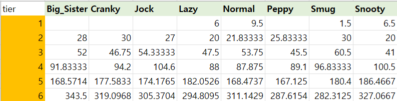 - 6 티어에서 가장 인기 없는 성격은 '단순 활발'이었습니다. 이는 전체 평균과 반대되는 결과입니다.
