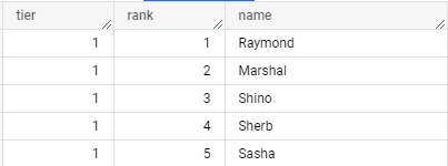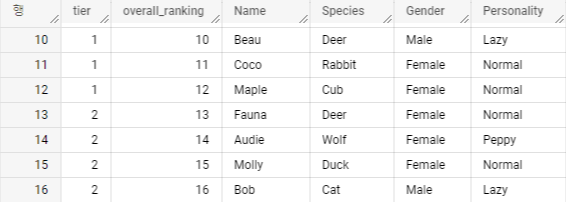 ( 미안하다 동물들아...) - overall_ranking : 기존 rank 열은 tier 별 순위였으므로, row_number() over()을 사용하여 테이블 행 수를 계산하여 전체 순위 구현