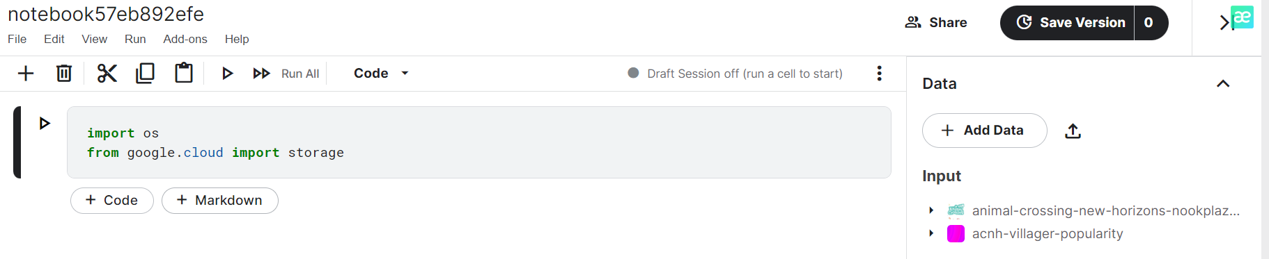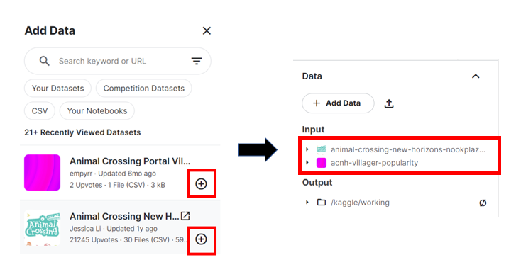 생성된 노트북의 우측 바 - Add Data를 클릭하여 자신이 필요한 캐글 데이터 셋을 추가합니다.