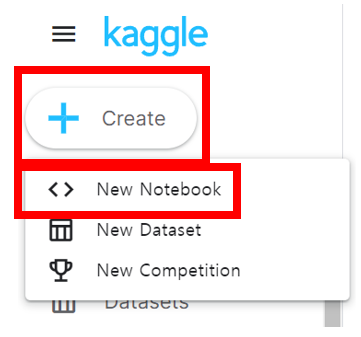 캐글 홈페이지에서 왼쪽 상단의 Create - New Notebook 을 클릭하여 새 캐글 노트북을 생성합니다.