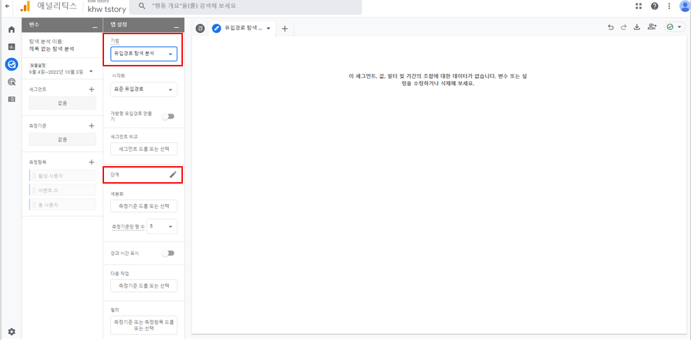 기법 - 유입 경로 탐색 분석을 선택한 후 '단계'를 선택합니다.