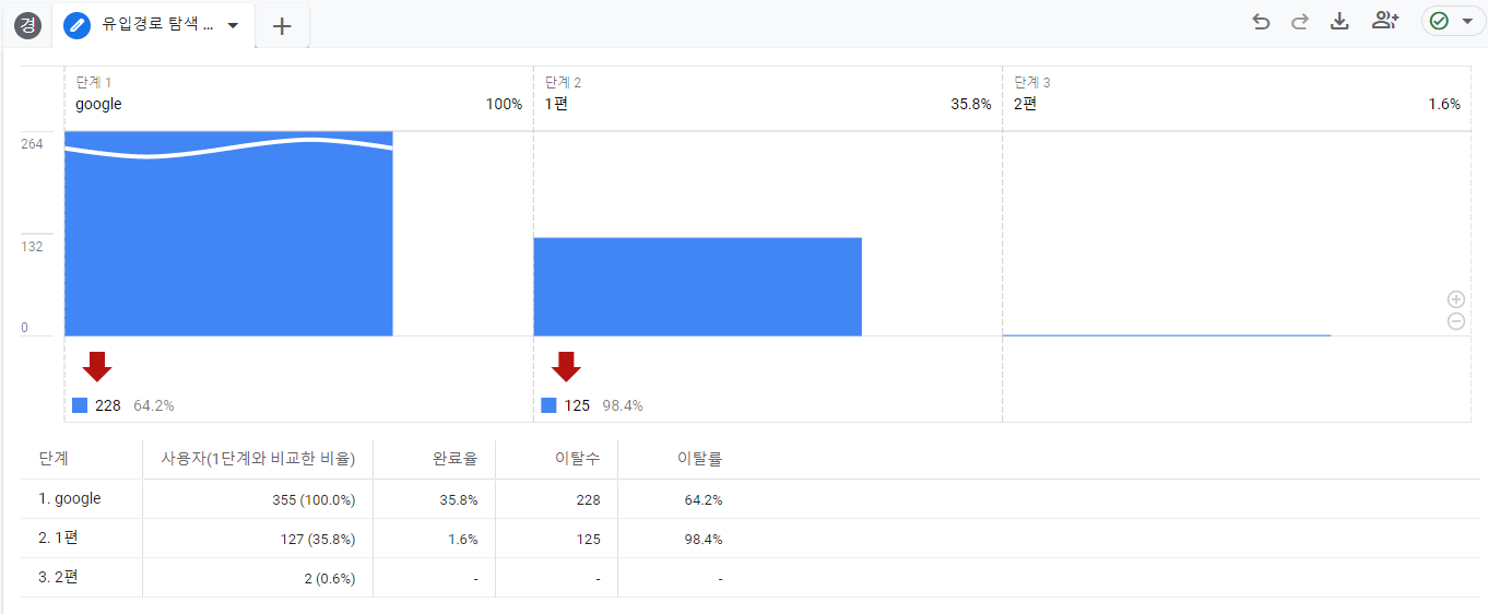 이 단계에서 구글 접속 첫 사용자의 이탈률은 98.4%이었습니다. (마음이 아프네요..ㅠㅠ) 이탈률이 높은 만큼 1편 글에서 2편 글로 이동을 유도하는 시도가 매우 필요해 보였습니다.
