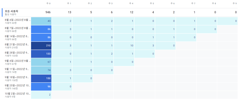 8월 첫째 주, 넷째 주에 처음으로 접속한 사람은 비교적 유지가 잘 되었으나, 셋째 주에 처음으로 접속한 사람은 유지율이 매우 낮았습니다. 또, 전체적으로 첫 접속 이후 유지율이 낮은 상황이니 만큼, 접속자에게 구독을 유도하거나, 지속적인 글 공유 등이 필요해 보였습니다.