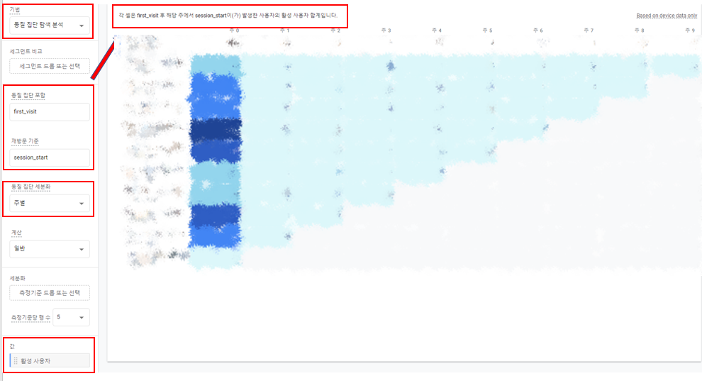 기법 - 동질 집단 탐색 분석을 선택합니다. 다음으로 동질 집단 : first_visit, 재방문 기준 : session_start를 선택합니다.