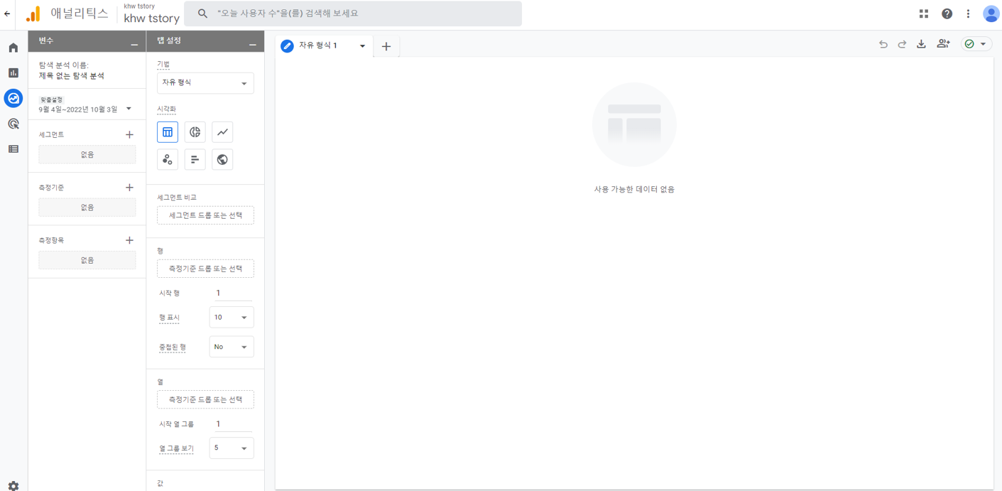탐색 분석 보고서의 첫번째 화면입니다. 좌측 바를 조정하여 분석해보겠습니다.