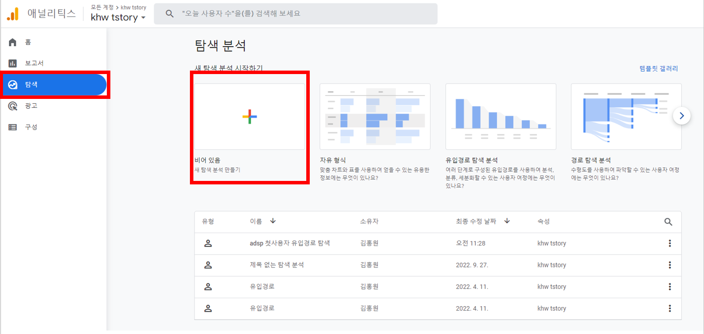 좌측 바의 '탐색' 에 접속하여 '비어있음'을 클릭하여 새 탐색 보고서를 만들어주세요.