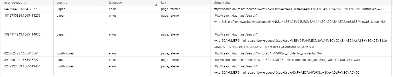 where 절에 value.string_value like '% daum%'으로 page_regerrer에 daum이 포함된 사람을 추출하였습니다.