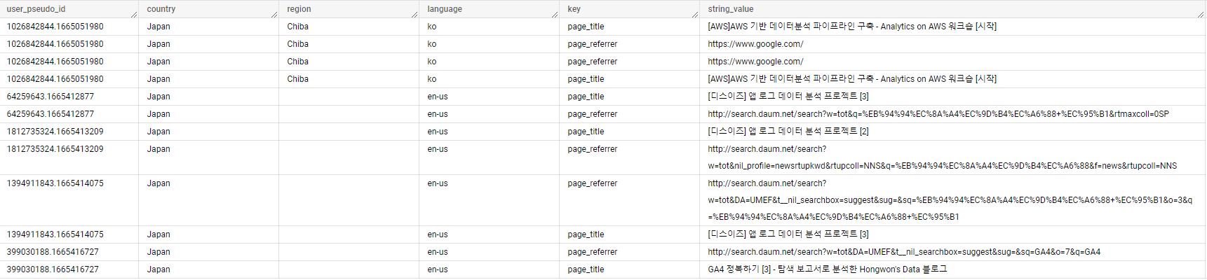 이외의 4분은 나라는 일본이나, 지역명이 없고, 언어는 영어인 점이 이상합니다. 그리고 page_referrer 가 daum 인 것을 보아 이분들 역시 한국인임을 알 수 있습니다.