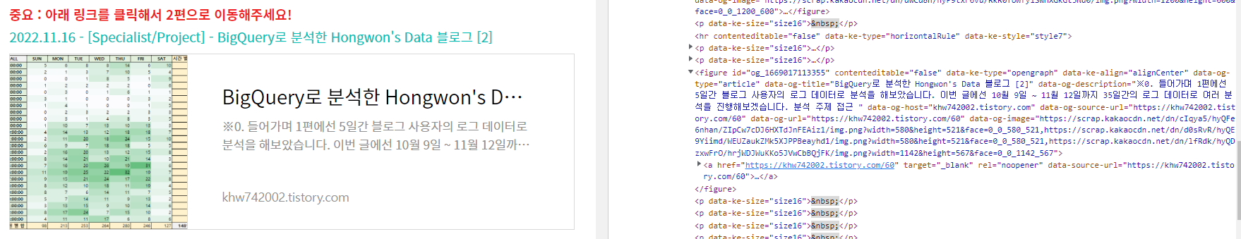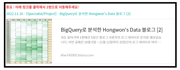 BigQuery로 분석한 Hongwon's Data 블로그 [1] 글 하단에는 위 사진과 같은 2편 링크 버튼이 있습니다.