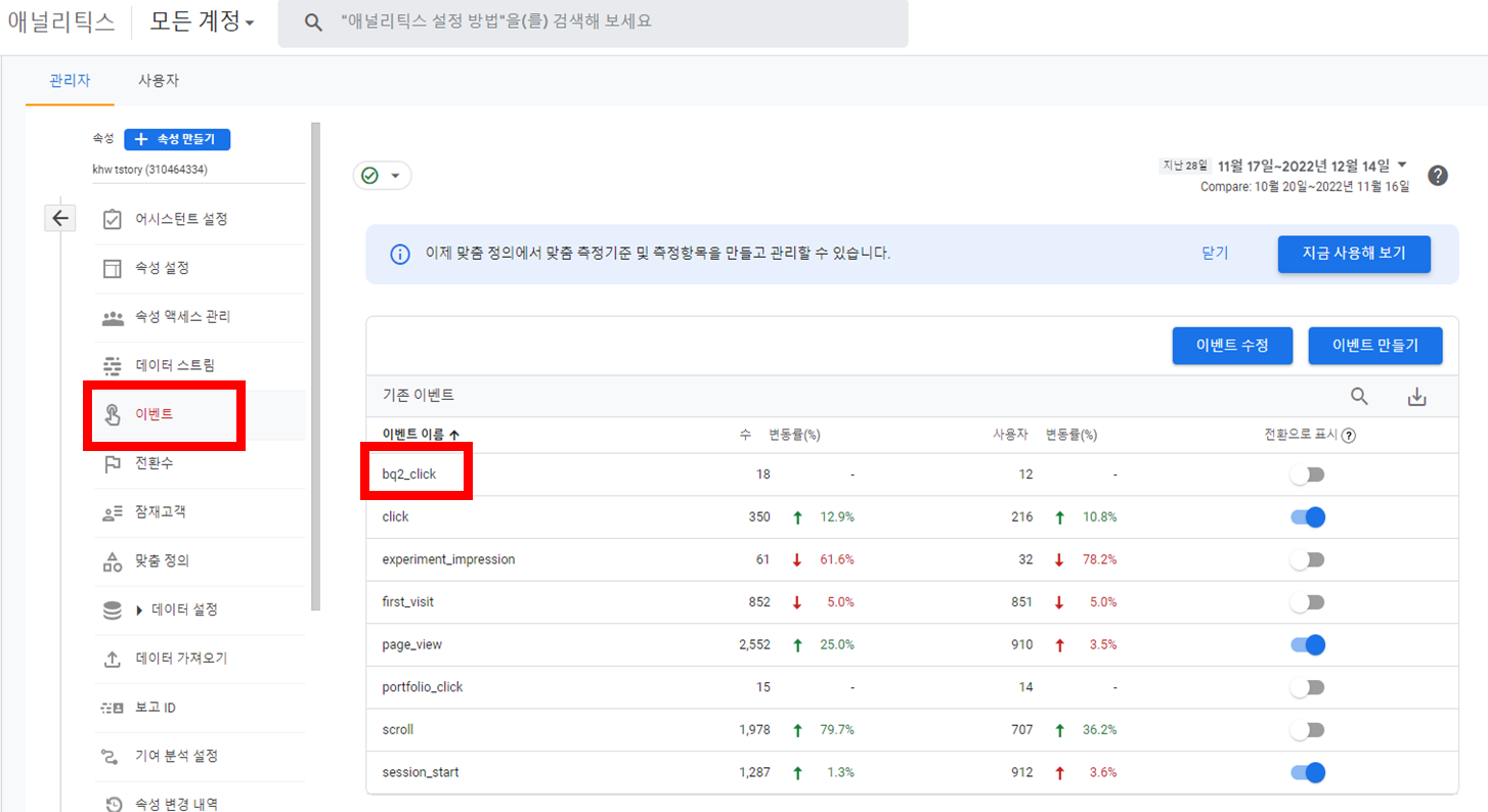 맞춤 목표를 설정하기 위해 구글 애널리틱스에서 이벤트를 생성했습니다.