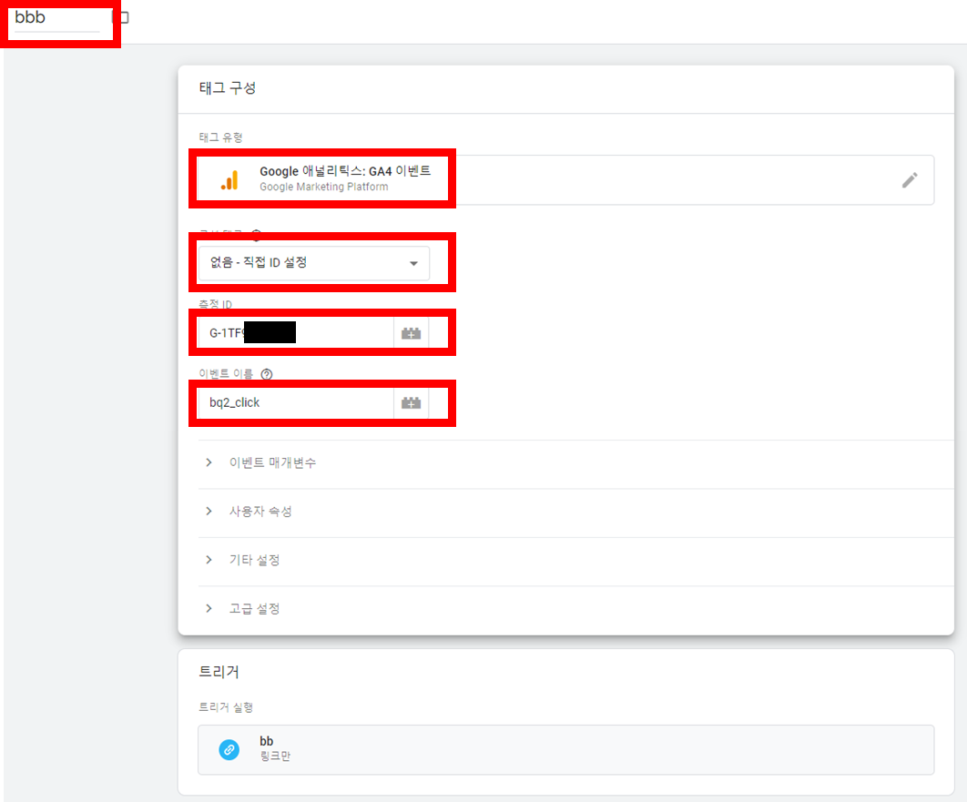 [GA4 - 이벤트 선택] → [없음 - 직업 ID 설정 클릭] → [측정 ID : (구글 애널리틱스 측정 ID)] → 이벤트 이름 작성
