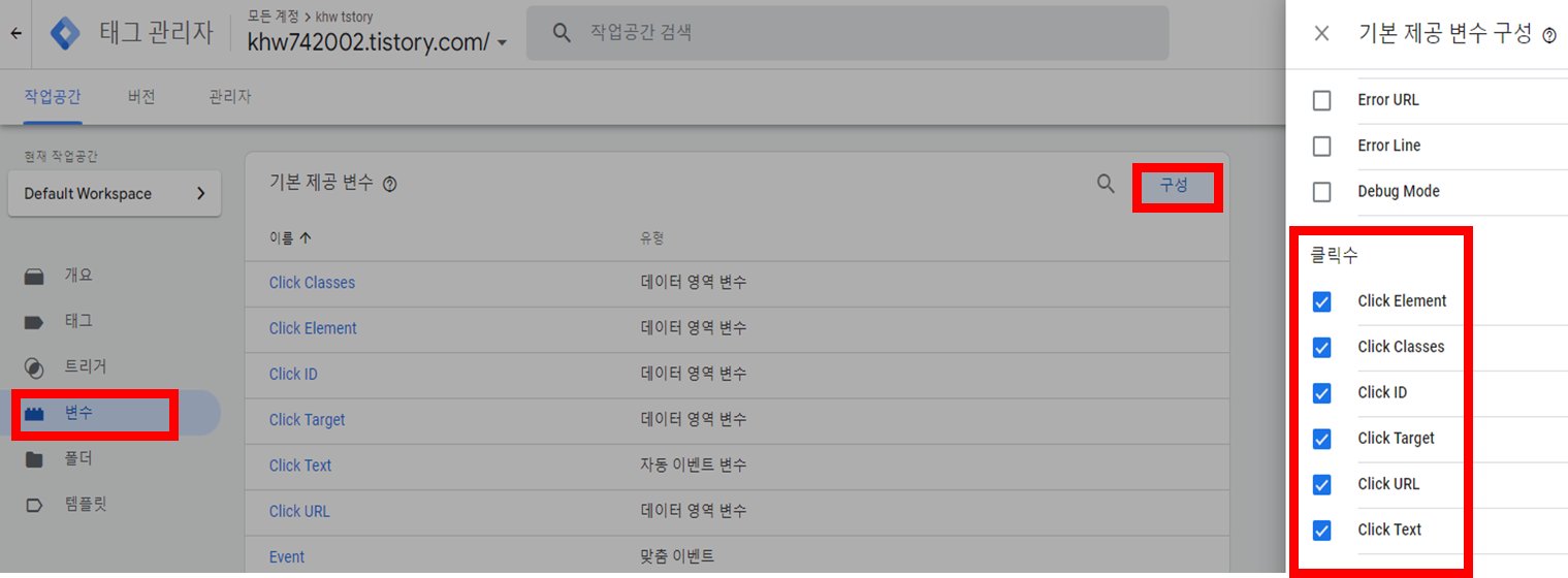 변수 - 기본 제공 변수 [구성] - 클릭 관련 변수들을 체크합니다.