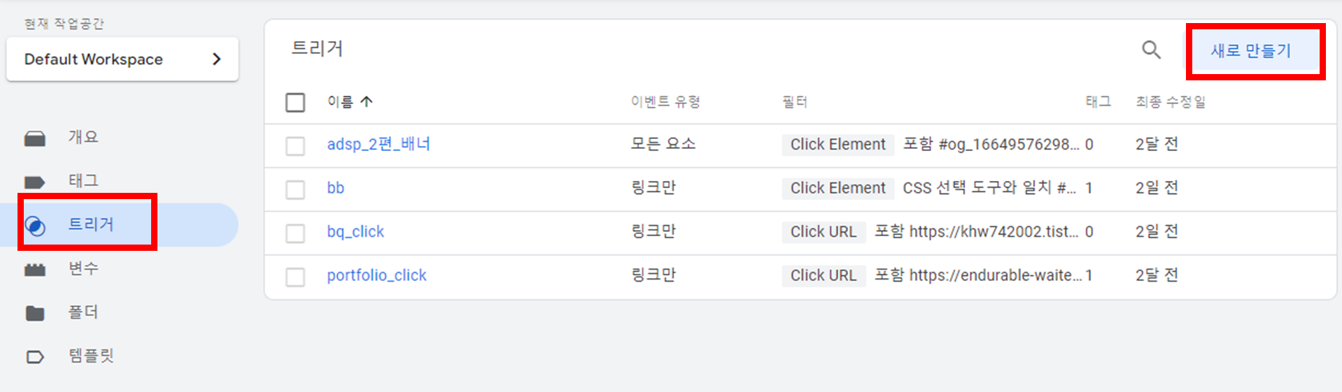트리거 - 새로 만들기 클릭
