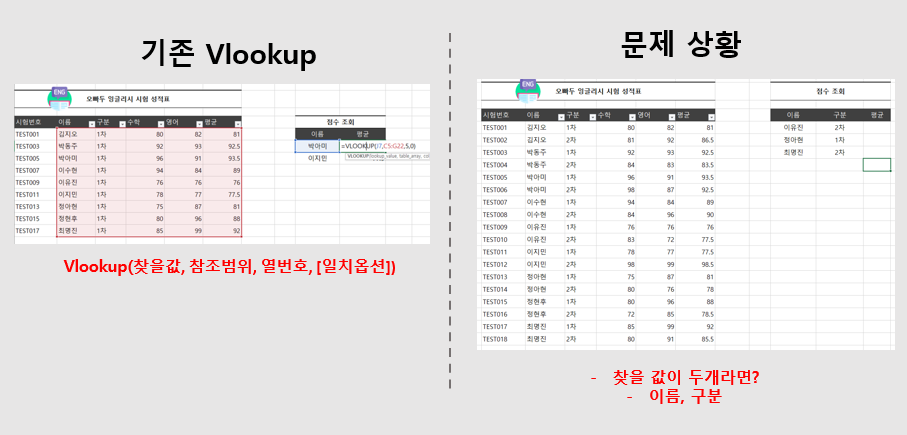 Vlookup 함수 사용 시, 위와 같이 찾을 값이 두 개일 경우가 자주 발생합니다.