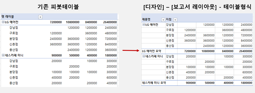 행 영역에 값이 추가될 경우, 테이블 형식으로 표시하는 것이 깔끔합니다.