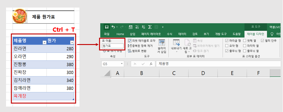 - 기존 원가표(셀)를 표로 만들기