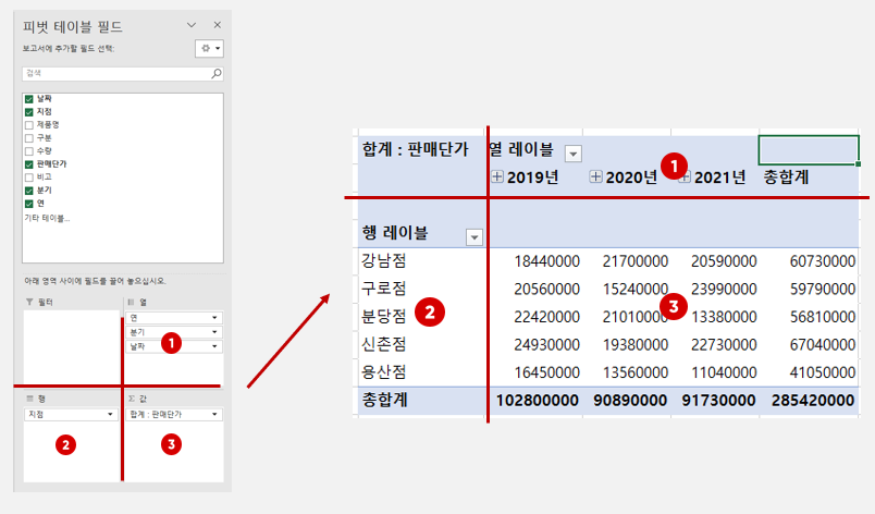 피봇테이블은 위와 같이 십자 모양으로 생성됩니다.