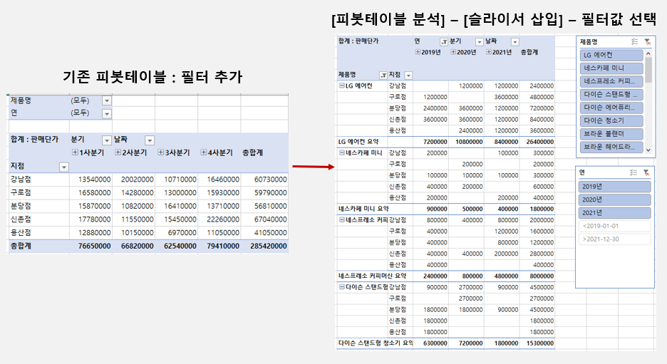 피봇테이블 - 필터 대신 슬라이서를 활용하여 피봇테이블을 필터링합니다.