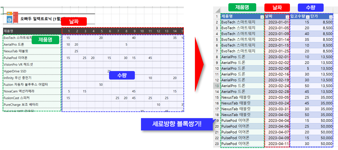 좌측 테이블의 [날짜]는 머리글이 아닌, 날짜 데이터 값이므로 우측 테이블과 같이 날짜 열을 생성해야 합니다.