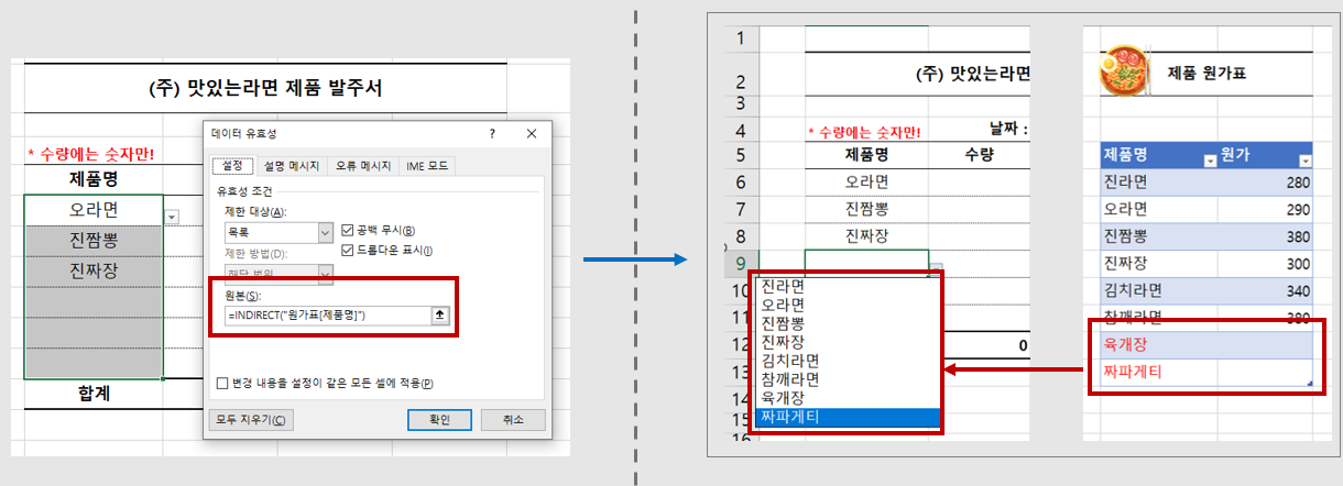 유효성검사 / indirect("원가표[제품명]")을 입력하여,