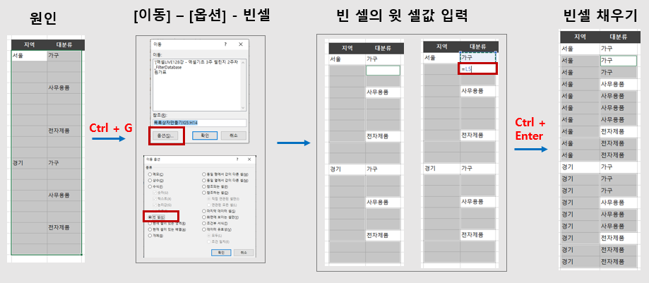 우측 문제 상황: [지역],[[대분류]] 셀 병합이 생성된 상황에서,