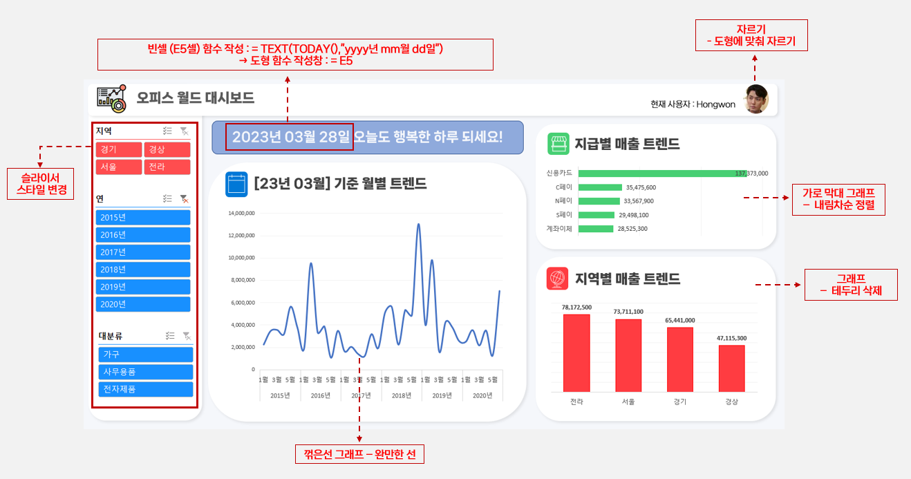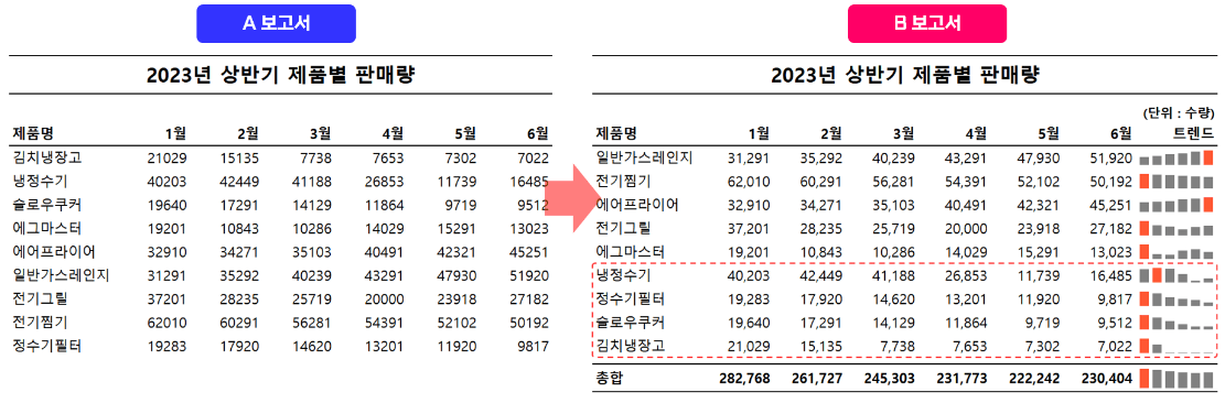 - 스파크라인과 차트를 적극 활용하여 한눈에 파악하도록 표시