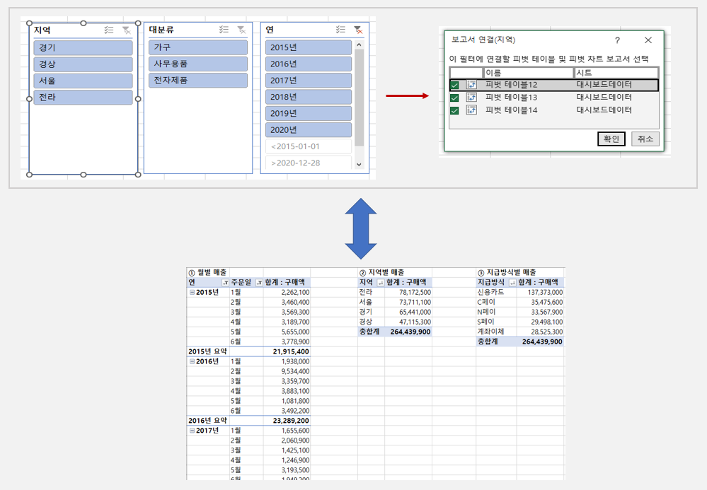 대시보드에 사용할 슬라이서 모두 '보고서 연결' 합니다.